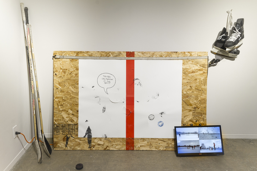 Jordan Schwab and Patrick Bulas’ puck prints employ recreational physicality that is deeply cultural, that of ice hockey, to generate the force required to make a print. The marks left by legible and illegible inked slapshots seem secondary to their novel, imperfectionist printmaking technique; the knowledge of the performance-process is integral to the prints’ value and apprehension, and their exhibition in a print studio’s gallery underlies the irony of their approach.