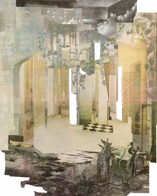 Within my collaged images, only the remnants of figures remain: plants, lights, a hand holding a precious belonging. Like my memories, the prints are full of gaps, blurring, evasions, and repetition. Though my printed interior spaces and their objects are chosen for their personal association—emotionally charged to me—I believe that the negative space in each collaged image and installation work allows viewers to connect with each image through their own experiences. The specifics are decipherable only to me, while the viewer has the opportunity to fill each interior space with their own memories.