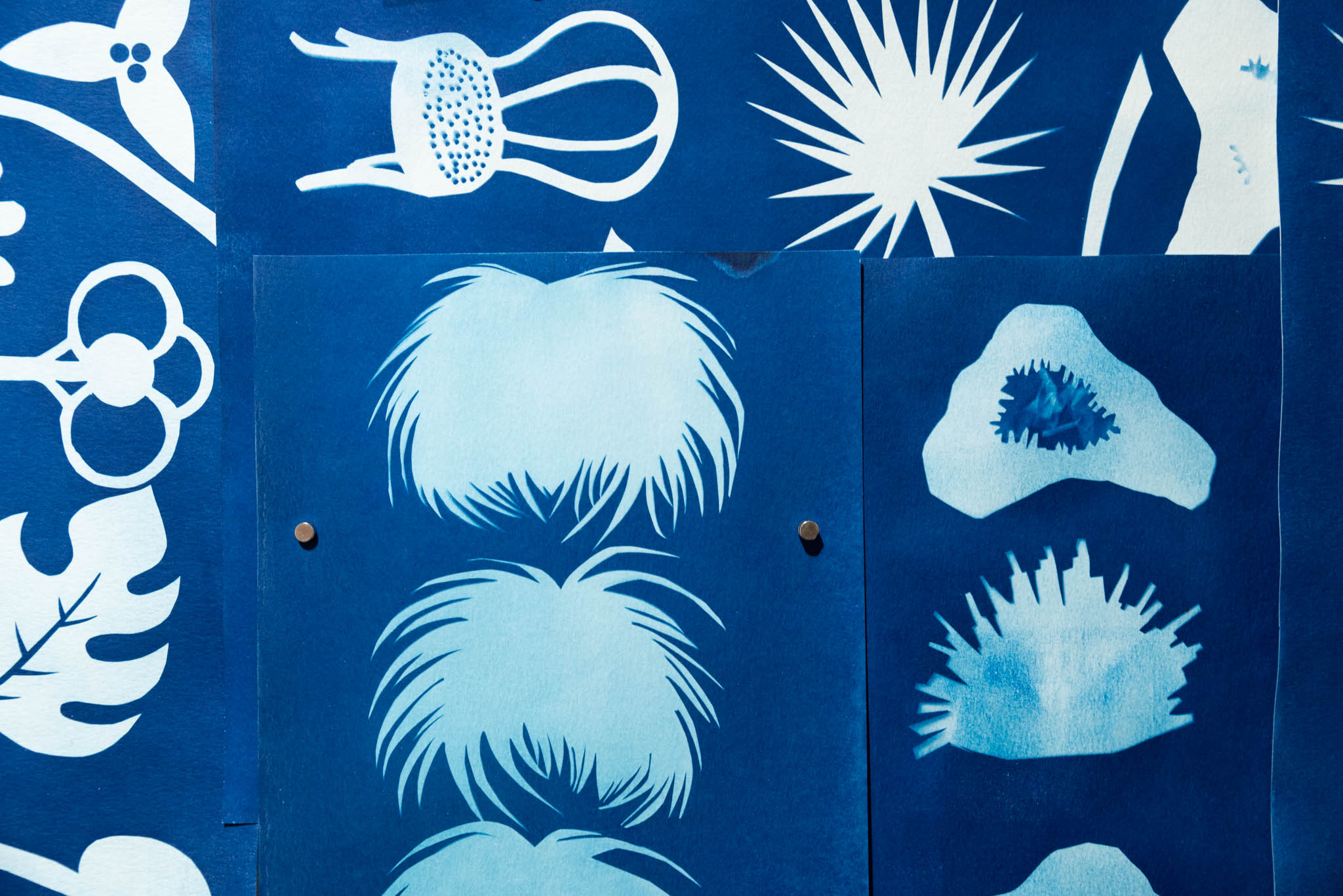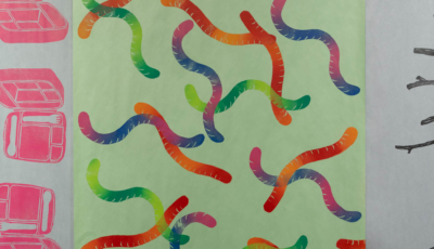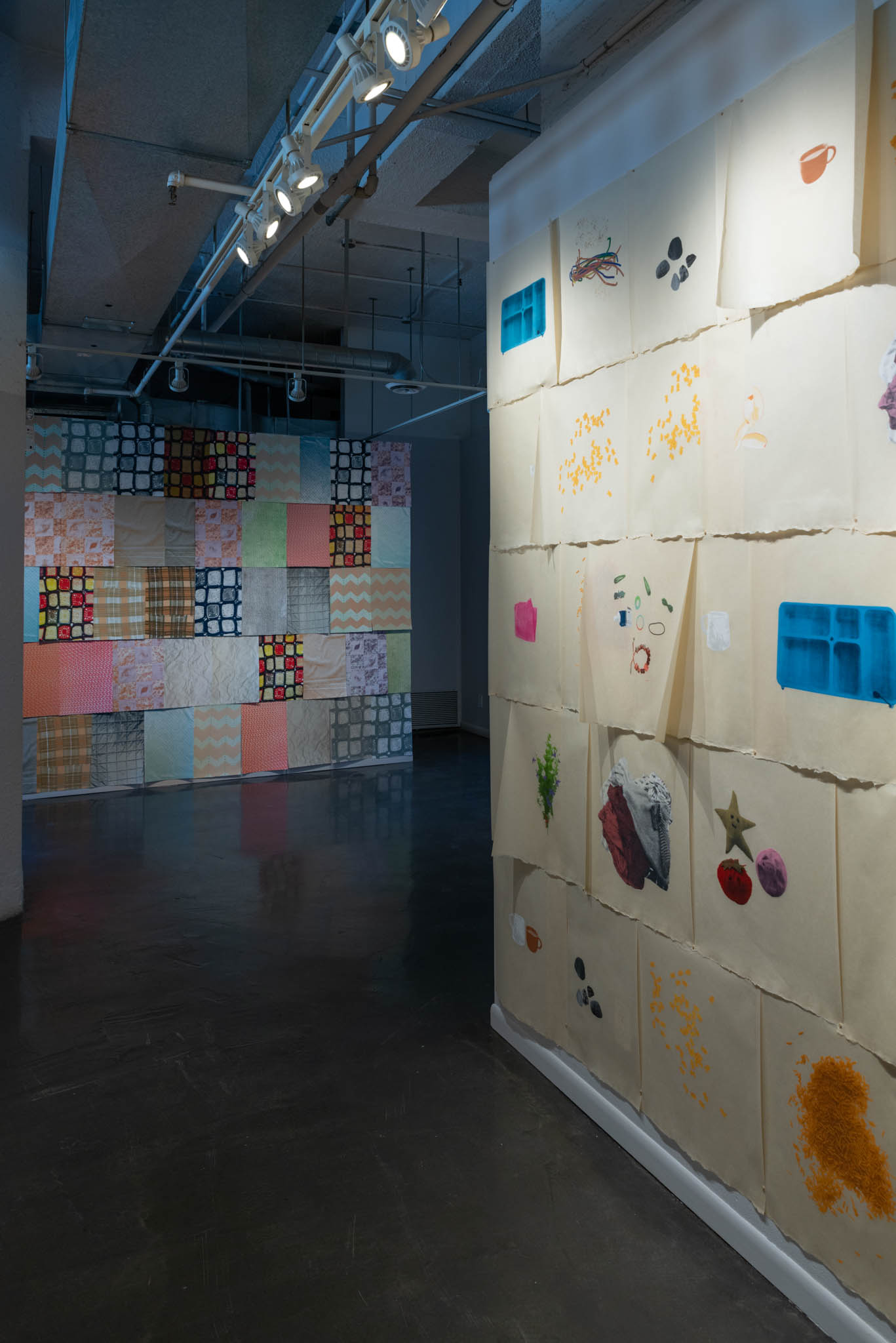The colourful, multi-technique prints (screen, relief, intaglio and cyanotype) are layered and arranged as a large scale installation, visually overwhelming the viewer with repetition, a feeling familiar to parents. Snacks, laundry, lunch boxes, sticks and toys are among a collection of items printed by Yuen and Hall-Patch. Presented in multiples, these objects of comfort and utility embody the ongoing routine and responsibilities of parenting. Full-time working parent artists like Yuen and Hall-Patch create in small pockets of time, so proofs and imperfect prints are shown and considered an important part of their processes.